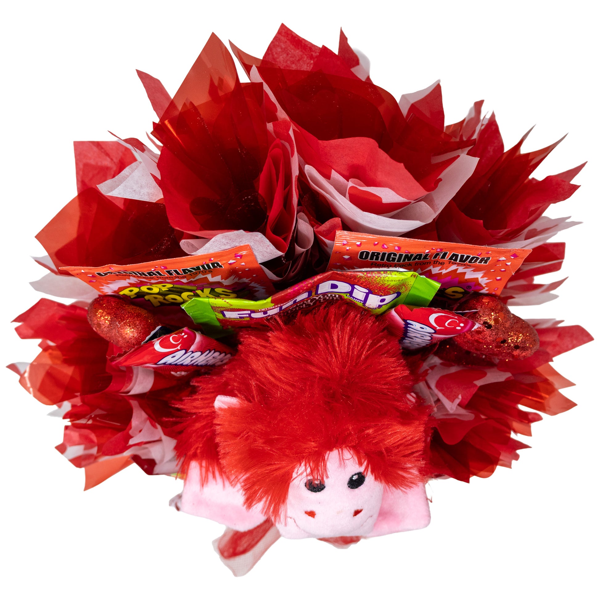 Each of these handcrafted Valentine's bouquets includes a variety of sweet treats for them to enjoy and a plush keepsake monkey as well for them to remember the special day for years to come.